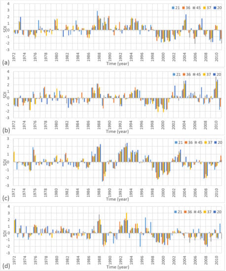 Since there were 47 stations over the study area, the SDI values of the stations that were located close to the outlet are depicted in the results. As seen in Figure 1, stations 21, 36, 45, 37, and 20 were the closest stations to the outlet on the country’s border. On the basis of the 40-year time series data, the SDI series for all the reference periods, SDI-3, SDI-6, and SDI-12, are shown in Figure 6, Figure 7, and Figure 8, respectively for stations 21, 36, 45, 37 and 20.