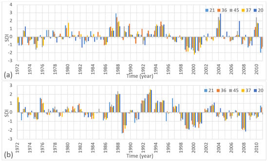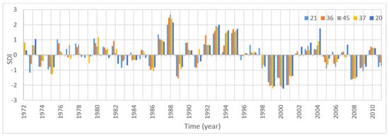 For the period October–December, the majority of the stations experienced droughts in the period April–June in the years between 1998 and 2002, and between 2004 and 2010 (Figure 6c). The most severe drought was identified in 1989 at stations 21 and 36, with SDI-3 values of −2.49 and −2.38, respectively.