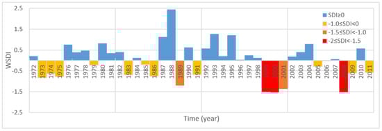 The drought conditions of the Tigris Basin for 40 hydrological years are shown in Figure 9. Each drought class is represented by a different color for a better visualization of drought intensity, e.g., the severe events are shown in red. As seen in Figure 8 and Figure 9, good similarities were obtained with the SDI-12 series for five stations and the WSDI series with all stations. Although some classification differences occurred in some of the years, such as 1973, 1984, 1985, and 2006, the differences in the index amounts were small. For example, in 1985 three of the five stations, stations 36, 45, and 37 showed non-drought conditions with SDI-12 values of 0.32, 0.32, and 0.14, respectively, and the other two stations, stations 20 and station 21, showed mild drought conditions with SDI-12 values of −0.19 and −0.28, respectively. However, the value of WSDI for the same year was −0.2. The averages of SDI-12 in the years 1999, 2000, and 2008 indicated that a severe drought occurred in the basin, and this description coincides with the WSDI values in Figure 9 for the same years.