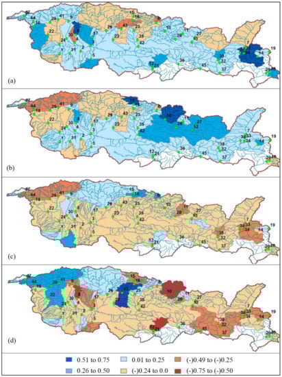 According to the results (Figure 9), the intensity and frequency of the drought conditions increased in every 10-year period. This increase is confirmed by the distribution of the average SDI-12 values for each sub-basin in every 10-year period, depicted in Figure 10. The red color in Figure 10 represents the average SDI-12 values lower than zero, indicating drought conditions. The blue color represents the average SDI-12 values equal to or greater than zero, indicating non-drought conditions. As seen in Figure 10, the areas that experienced drought increased over time. In general, drought conditions are dependent on mean latitude. Areas further south experienced drought earlier than areas further north. We observed that the intensity of drought increased with time. In the last 10-year period, two sub-basins had average drought values lower than −0.5 (Figure 10d). Before this 10-year period, average SDI-12 values this low were unprecedented.