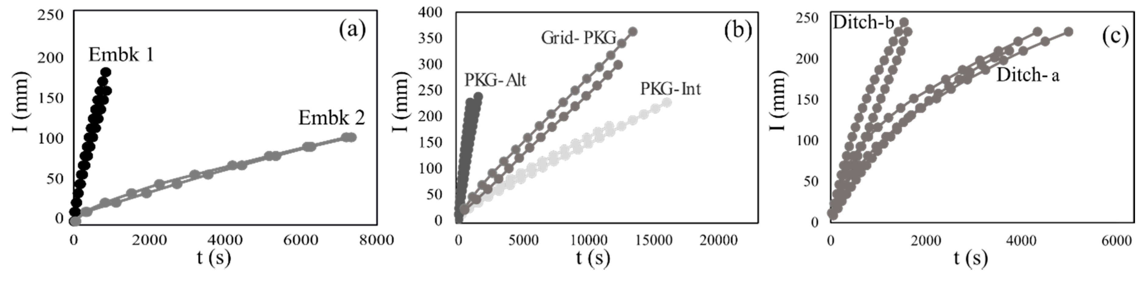- Mangala, O.S.; Toppo, P.; Ghoshal, S. Study of Infiltration Capacity of Different Soils. Int. J. Trend Res. Dev. 2016, 3, 388–390. [Google Scholar]