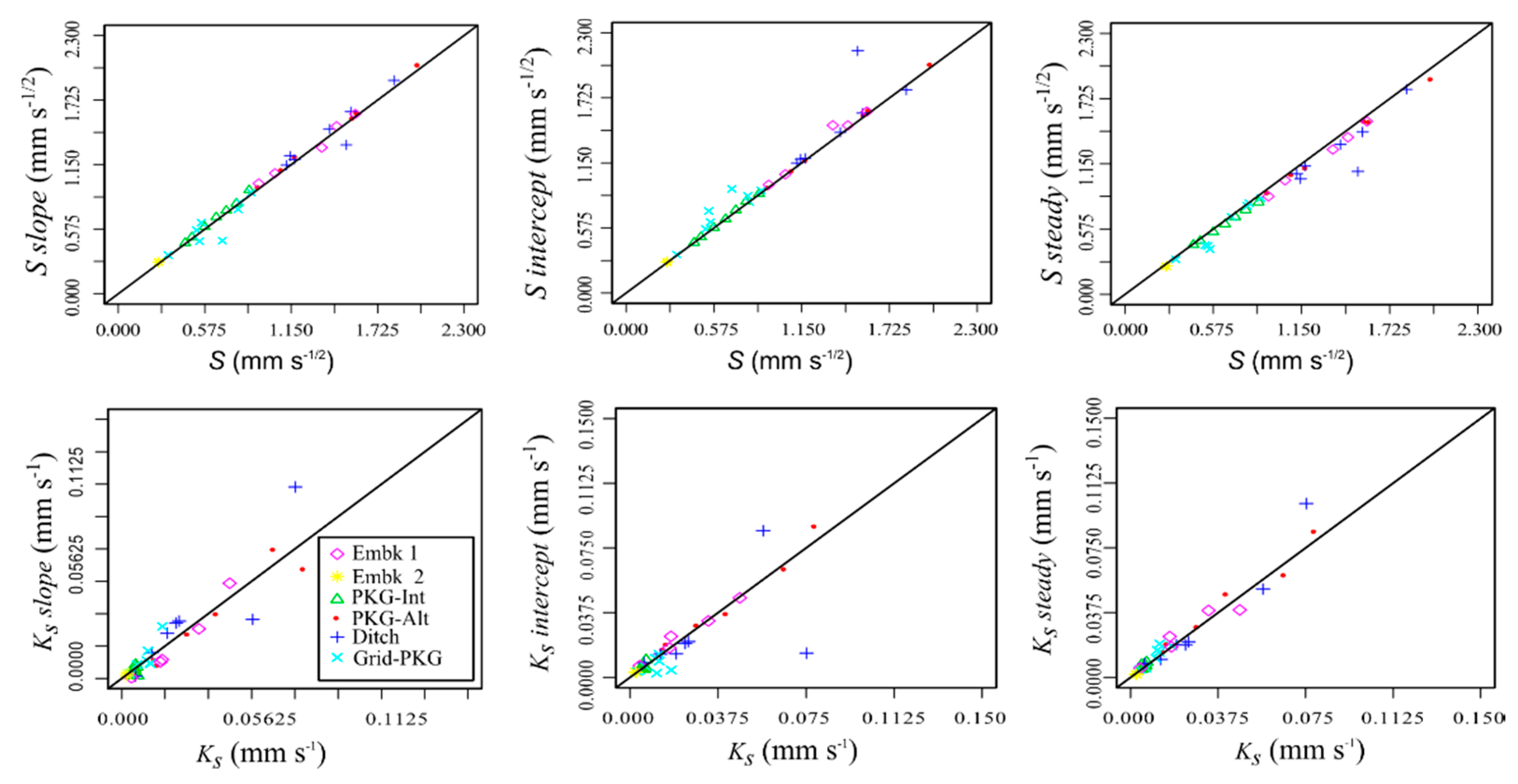 | The Haverkamp equation fitting on experimental data allows to calculate the sorptivity S and subsequently the saturated hydraulic conductivity Ks. | ||||||