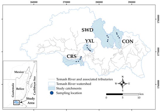 Locator map showing the study watershed (Temash River watershed) in southern Belize and the four catchments selected for in-stream nutrient monitoring-Crique Sarco (CRS), Yax Cal (YXL), Sunday Wood (SWD), and Conejo (CON). Coordinate system is Universal Transverse Mercator (UTM).