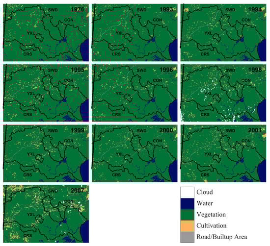 The Landsat images (Level 1 product) have a spatial resolution of 30 m. The SPOT image (Level 1B product) has a spatial resolution of ~23 m, which is georeferenced and resampled to 30 m, matching the Landsat images. To carry out remote-sensing image classification, training, and test data were selected randomly and verified through visual interpretation of the Landsat images and comparing Google Earth images as well as with field data. Details of the methods used for image classification are provided elsewhere [,,]. In summary, we tested two classifiers: maximum likelihood classification (MLC) using MATLAB discriminant analysis [] and support vector machine (SVM) implemented through the Library for Support Vector Machines (LIBSVM) MATLAB tool []. The two classifiers—MLC and SVM—returned similar classification accuracies, ranging from 93 to 98% for MLC and 96 to 99% for SVM. The SVM classification tended to overestimate cultivation area for this region. Thus, further processing was based on the results of MLC. For this analysis, we did not apply the median filter to the class maps because the individual patches under cultivation in the study watersheds and the larger Temash River watershed are relatively small and very sensitive to the median filter. The final class maps contained five land cover types: road/built-up area, cultivation, vegetation, water, and cloud (for some years).