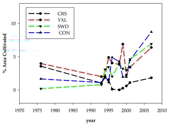 Percent of total land area under cultivation within the four study catchments, during the time period 1976 to 2007 (CRS = Crique Sarco Creek; YXL = Yax Cal Creek; SWD = Sunday Wood Creek; CON = Conejo Creek).