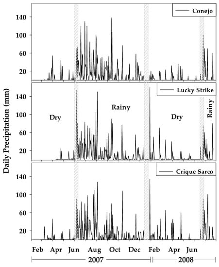 The rainy season began on June 4 and the dry season started on 19 December 2007 (Figure 4). The 2007–2008 dry season lasted until 20 May 2008. Total precipitation from the onset of the rainy season in 2007 to the onset of the rainy season in 2008 at each of the three rain gauge stations was >3600 mm, and >80% of the total annual rainfall fell during the rainy season.