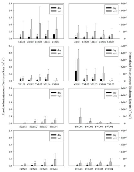 Instantaneous discharge rates were averaged seasonally (e.g., dry vs. wet) at each sampling site within each catchment (Figure 5). Mean dry season instantaneous discharge from each catchment (i.e., the farthest downstream sampling point) ranged from 0.015 ± 0.04 m3 s−1 (YXL05) to 0.31 ± 0.24 m3 s−1 (CRS05). Wet season instantaneous discharge was greatest from the CRS catchment (0.66 ± 0.83 m3 s−1). Dry season and wet season discharge rates were significantly different across all sampling sites with the exception of CRS05, YXL01, and YXL05 (Table 2). Absolute discharge rates generally increased from upstream sites to downstream sites within each catchment (Table 2, Figure 5). Mean instantaneous discharge rates were positively correlated with antecedent rainfall, although the strength of the correlation with respect to length of the antecedent rainfall period (i.e., 1 day, 7 days, 14 days, and 28 days) differed among catchments (Table 3). Discharge rates were normalized by catchment area to remove the effect of catchment size and presented as seasonal averages (Figure 5). Normalized seasonal mean discharge rates at upstream sampling sites vary by more than three orders of magnitude during the dry season with similar variability during the wet season (Figure 5). Seasonal mean normalized discharge rates vary much less at the most downstream sampling sites (Figure 5).
