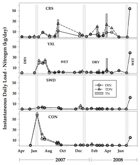 The contribution of DIN to the TSN pool was highly variable across seasons and across study catchments. In CRS, DIN comprised 58% of both the dry season and rainy season TSN pool at both upstream and downstream sites. TSN comprised 60% of the TN pool on average during the dry season and contributed 86% during the wet season. In YXL the average contribution of DIN to the TSN pool was between 64% and 88%. The TN pool in YXL averaged more than 60% TSN during the dry season and during the rainy season included 91% TSN. In SWD, DIN comprised 49% of the TSN pool during the dry season and more than 75% during the rainy season, with a similar pattern of DIN:TSN observed in CON. During the rainy season in both SWD and CON, DIN contributed more than 70% to the TSN pool on average. TSN comprised approximately 90% of the TN pool during the rainy season in SWD and averaged between 73% and 100% in CON.