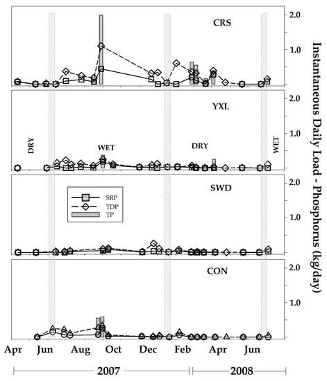 Daily phosphorus loads were low across all study catchments, rarely exceeding 0.5 kg day−1 (Figure 7). A small increase was observed following the onset of the rainy season (late June 2007) in CRS, YXL, and CON. A large pulse of TP, TSP, and SRP was observed in CRS in late August, with a TP flux of ~2.0 kg day−1. Sampling in CRS after the onset of the dry season (January 2008) revealed additional fluxes of P. P fluxes remained low through the dry season, with the onset of the rainy season in June 2008 showing a small increase in P flux that occurred at the end of the sampling (Figure 7).