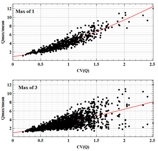 The selected Qmax (1 and 3) (i.e., the top 1 and 3 maximum data points from each station’s AMFS data, referred to as Qmax), are first standardised by the at-site average of the AMFS data (mean), and then plotted in the (CV, Qmax/mean) plane. Figure 5 shows such a plot for (1 and 3 max) the study data set, consisting of 626 data points (1 max), 1878 data points (3 max) from 626 sites, which suggests the following relationship: