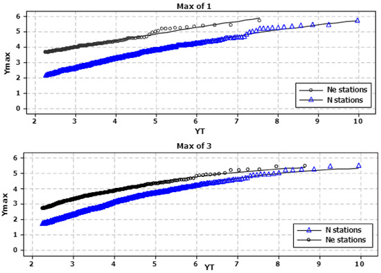 Equations (9) and (10) yield the analytical expression of the LFRM model for the study data, set using the top 1 and 3 annual maxima. The appropriate values of the coefficients in Table 3 are substituted into Equations (9) and (10). However, this formulation does not allow for the effects of the inter-site dependence.