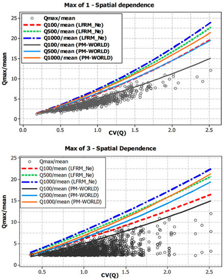 Various Qmax/mean quantiles derived from the LFRM_Ne model and PM (World) model. (Top panel) Maxima 1—no spatial dependence; (middle panel) Maxima 1—spatial dependence accounted for; (bottom panel) Maxima 3—spatial dependence accounted for.