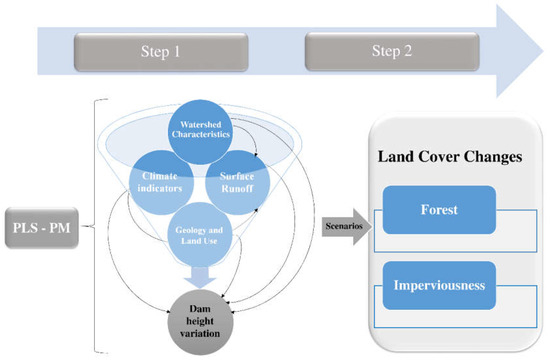 The rationale and inventory of variables used in PLS-PM followed the guidelines of an antecedent work [16]. In Step 2, the model equations derived from Step 1 were used to analyse scenarios of dam-height variation in response to anticipated land cover changes mostly related with forest spreading and reduction of impermeable surfaces.