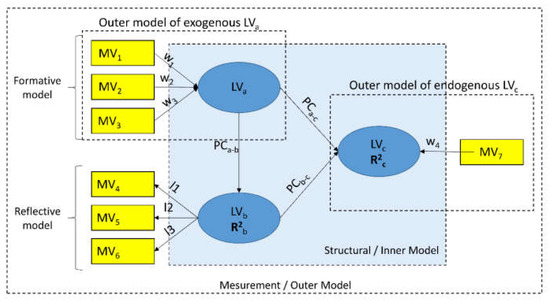 Partial Least Squares (PLS) models, originally developed by Herman [33,52,53] and Reference [54], are powerful tools for analysing multivariable data [55]. Considered as a soft modeling approach, Partial Least Squares-Path Modeling (PLS-PM) is a statistical model where no strong assumptions, with respect to the distributions, the sample size and the measurement scale, are required [56]. It is used to model causal paths among blocks of variables called latent variables (LV) [34,57]. A PLS-PM consists of two elements (Figure 3), the outer/measurement model, which describes the relationships between the measured variables (MV) and their respective LV (i.e., the loadings and weights), and the inner/structural model, which describes the relationships between the LV (i.e., the path coefficients) [42,56]. The connections among LV are quantified thorough path coefficients (PC) while the connections between LV and MV are quantified through weights (w) [42]. For each regression in the structural model, the amount of variance in the dependent latent variable (also called endogenous) explained by its independent latent variables (exogenous), is indicated by the coefficient of determination (R2). The influence of exogenous on endogenous latent variables is represented by direct or indirect path coefficients, depending on the number of paths linking them [34]. As can be seen in Figure 3, LVb has just a direct influence on LVc, which is PCb−c, while LVa has direct (PCa−c) as well as indirect (PCa−b, PCb−c) influences. According to [58], the indirect influence is the product of corresponding direct influences (i.e., PCa−b × PCb−c) and the total influence is the sum of direct and indirect influences (i.e., PCa−c + PCa−b × PCb−c).