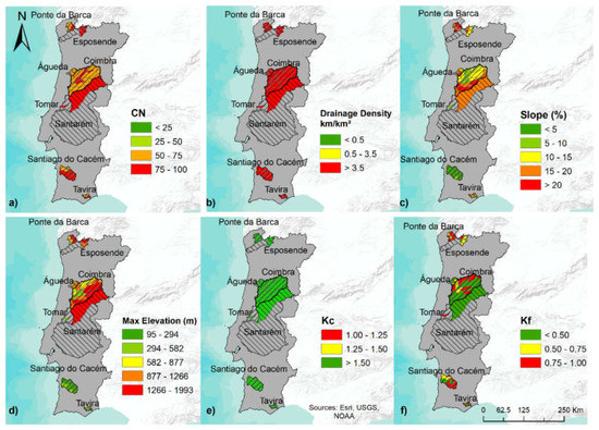 The spatial distributions of all measured variables are illustrated in the maps of Figure 4, Figure 5, Figure 6 and Figure 7. The watershed characteristics are illustrated in Figure 4. The CN values (Figure 4a), which predict direct runoff or infiltration from rainfall excess, tend to be large in all sub-basins, and in some zones can be larger than 75. The drainage density (Figure 4b), which measures the complexity and development of the watershed’s drainage system, is high in all zones and their sub-basins (CN > 3.5 km/km2), meaning that they are exceptionally well drained. As can be seen in Figure 4c, the slope in the northernmost areas of the country is higher. Coimbra is quite heterogeneous because it comprises sloping areas such as the Serra da Estrela and flat areas such as Santa Comba Dão. Santarém presents a considerable slope due to its proximity to the Serra da Estrela. The slopes are less pronounced to the south of Portugal, except in Tavira where the proximity to the Caldeirão Mountains makes the sub-basins steeper. The maximum altitudes (Figure 4d) are higher in the northern areas of mainland Portugal and decrease to the south, except for the region between Santarém and Coimbra where the Serra da Estrela is located. The Kc values in Figure 4e are higher than 1.5, which means that all sub-basins are moderately flood-prone. The values of Kf can be seen in Figure 4f. Central Portugal is characterized by lower Kf, while basins with smaller shape factors have a lower tendency to originate floods.