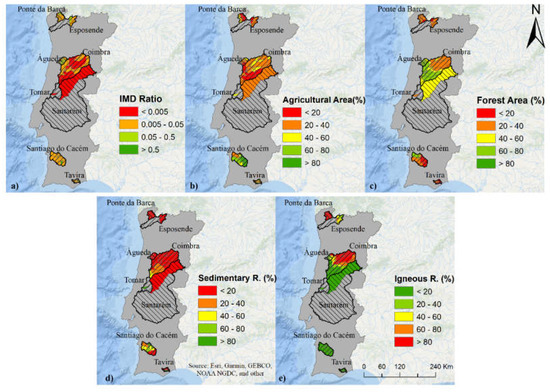 The spatial distributions of land use and geology are illustrated in Figure 5. The values of IMD ratio (Figure 5a) are lower in the more urban impermeable areas. As regards the use for agriculture or occupation by forest (Figure 5b,c) the areas are both small in Ponte da Barca and Esposende. In Águeda and Coimbra, the percentage of agricultural area is low but the percentage of forest area is considerable. In Santarém, the forest area is larger than the area used for agriculture, while in Tomar the situation is reversed. Santiago do Cacém and Tavira, in general, present a large percentage of agricultural area and low percentage of forest area. As regards geology (Figure 5d,e), the sedimentary rocks prevail in zones closer to the coast, namely Tomar, Santiago do Cacém and Tavira. The Igneous Rocks are well represented in the centre and south zones of the country.
