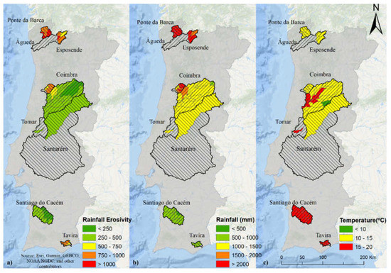 In Figure 6 the climate indicators can be visualized. Regarding rainfall erosion (Figure 6a), the most affected areas are Ponte da Barca, Esposende, Águeda and Tavira. With regard to total annual precipitation (Figure 6b), the trend is to decrease from north to south of the country. The temperature (Figure 6c) increases from north to south, except for some sub-basins of Coimbra and Tomar that present values similar to the zones of the south.