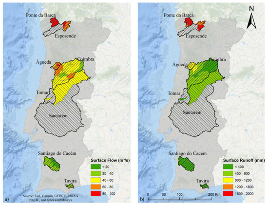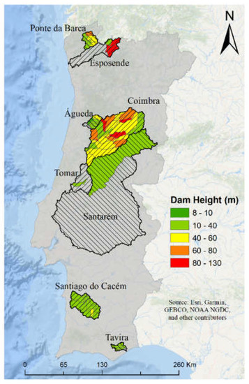 Runoff (Figure 7a,b) follows the downward trend from north to south. The spatial distribution of the dam heights is illustrated in Figure 8. The figure shows that the areas with the greatest heights are Esposende and Coimbra, where dam heights can exceed 80 m. Ponte da Barca also presents some sub-basins with heights between the 60 and 80 m. In Águeda and Santiago do Cacém the heights do not exceed 60 m while in the remaining zones the heights are ≤40 m.