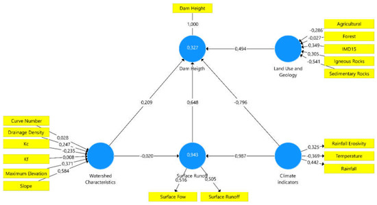 The reliability, validity and VIF constraints were confirmed in this study. The PLS-PM model is portrayed in Figure 9. The variances explained by the model are high for the endogenous LV “Surface Runoff” (R2 ≈ 0.9) but relatively low for the LV “Dam Height” (R2 ≈ 0.3). Despite the low score of LV “Dam Height” the model is robust and reliable because the sample is large. All the path coefficients expose positive causal effects with the LV “Dam Height”, except the LV “Climate Indicators” which are negative. The weights of most MVs are positive, which means that the LVs increase for increasing values of their formation variables. The negative weights mean that the increase of correspondent MVs contribute to the decrease of dam height.