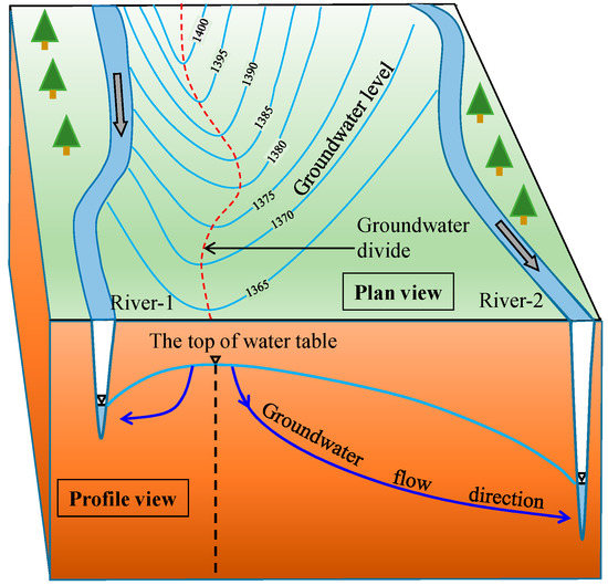 Hydrologists study the water cycle and transport of accompanying materials in regions based on watershed divisions. A watershed or drainage basin is an area enclosed by a divide line that can be described with topographic ridges, i.e., with local land surface top points. This definition is fine for surface water studies but is not always effective in groundwater studies. The groundwater divide between basins may be different from the topographic divide [1,2], and it causes inter-basin groundwater flow (IGF) that has been identified in hydrogeological surveys [2,3,4]. In the past few decades, researchers have highlighted the impacts of IGF on the geochemical characteristics [5,6,7], the regional climate–hydrological interactions [8], and the geomorphic evolution [9] of river basins. An exact description of groundwater divides is necessary to quantitatively interpret the features of IGF.