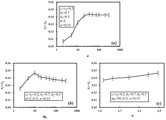 Dependency of the difference between xd and xt on control parameters. (a) w, (b) k, (c) h1–h2, (d) z1–z2.