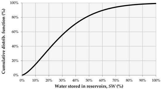 where, f(SW) and F(SW) are, respectively, the probability density function (PDF) and the cumulative distribution function (CDF) for the water stored in reservoirs (SW) expressed as a percentage of the maximum value in the historical data, k is the shape parameter and λ is the scale parameter of the distribution. More specifically, for the sub-basin of Regulación General, this PDF was fitted using the values k = 1.484 and λ = 0.347, as illustrated in Figure 1.