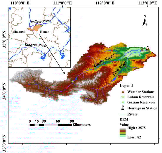 Daily minimum temperature, maximum temperature, precipitation, relative humidity, wind speed, and sunshine duration at 12 meteorological stations and daily evaporation at the Guxian hydrological station during 1969–2015 were obtained from the National Meteorological Information Center of the China Meteorological Administration, as shown in Figure 1. Evaporation was monitored using E601B pan.