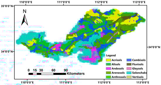 The Yiluo River Basin (33°–35° N, 109°–113° E) covers an area of around 18,563 km2 (Figure 1). The river, which is 449 km long, runs from Shaanxi Province through Henan Province and into the Yellow River in the city of Luoyang. The Heishiguan hydrological station is located at the outlet of the Yiluo River in the northeast of the basin. The Yiluo River has two principal tributaries: the Yihe River and the Luohe River, on each of which is a large reservoir. The Lushun Reservoir, which is located in the middle reaches of the Yihe River, was completed in 1965. The Guxian Reservoir, located in the middle reaches of the Luohe River, was completed in 1994. There are ten types of soil within the Yiluo River watershed: Acrisols, Alisols, Andosols, Arenosols, Anthrosols, Cambisols, Fluvisols, Gleysols, Solonchaks, and Vertiaols (Figure 2). The major land use classes of the region are cultivation (AGRR), barren (BARR), forest (FRST), grassland (RNGE), urban (URBN), and water (WATR) (Figure 3).