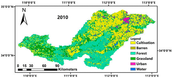 Map of land use maps in 2010 in the Yiluo River Basin (maps for 1980, 1990, and 2000 not shown).