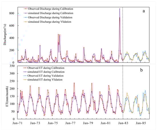 Simulated and observed monthly (a) discharge and (b) actual evapotranspiration (ET) during calibration period (1971–1982) and validation period (1983–1985).