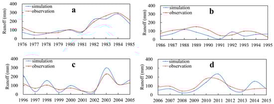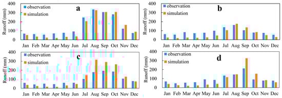 Comparison between the simulated and observed annual runoff values for scenarios (a) S1, (b) S2, (c) S3, and (d) S4.