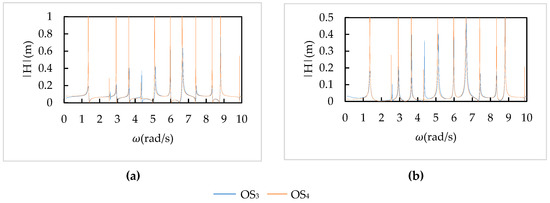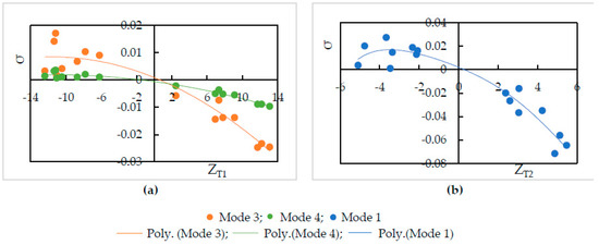 The solution of Equation (42) gives the complex natural frequency () of the entire hydraulic system. The mode shapes were plotted for the first five natural frequencies, which are based on corresponding complex natural frequencies.