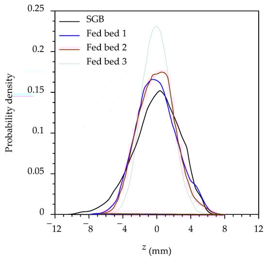 Probability density functions of bed surface fluctuations with respect to the mean surface level in WGBs (namely, Fed bed 1, Fed bed 2, and Fed bed 3) and an SGB (data extracted from Cooper and Tait [12]).
