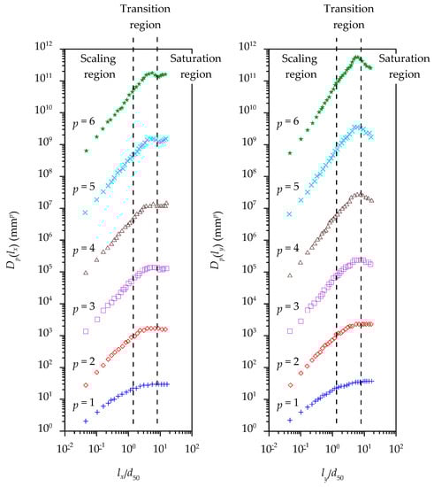 Nikora et al. [17] computed the structure function up to the sixth-order (p = 6) using the concept of Kolmogorov [20]. Similar to the second-order structure function, the shape of the Dp(lx, ly) can be divided into three regions: scaling, transition and saturation regions (Figure 4) [17]. Interestingly, they revealed that, in WGBs, the boundary between the scaling and transition regions is of the order of the median gravel size d50, while the boundary between the transition and saturation regions is of order of d90, where d90 is the 90th percentile of a particle-size distribution. Akin to Nikora et al. [8], in Nikora and Walsh [17], the analysis of Dp(lx, ly) suggested that the grain scales are isotropic, indicating that the Dp(lx, ly) is independent of the axis rotation. However, within the transition region, the Dp(lx, ly) becomes anisotropic. Further, within the scaling region, the scaling exponent ξ plays an important role. For small values of lx and ly, the ξ varies linearly with p. Nevertheless, as p increases, the ξ varies nonlinearly with p, suggesting a multiscaling behavior of roughness structures in WGBs, being sensitive to the flow direction (Figure 5). The reason is attributed to the shape and the spatial arrangements of gravels [17].
