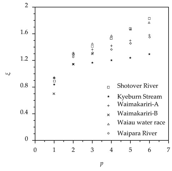 Variations of scaling exponents ξ of the generalized structure function with the order p (data extracted from Nikora and Walsh [17]).