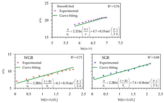 Pu et al. [30] used the velocity data of each bed to obtain the fitted curves for the log-wake laws (Figure 7). Interestingly, the values of Br are lower in both the smooth and the rough (WGB and SGB) beds than the traditional values: Br = 5.5 and 8.5 for the smooth and rough beds, respectively. Further, even though the flow conditions of both the WGB and SGB were identical, they observed that the Br in the WGB was smaller than that in the SGB. It implies that, in the near-bed flow zone, a WGB roughness structure affects Br and, in turn, the velocity profile. In addition, the comparison of Π values in the WGB and SGB revealed that the values of Π remain the same in the velocity profiles of both the beds, suggesting that the water-work has an insignificant impact on the Π, which mainly governs the velocity profile in the outer layer.