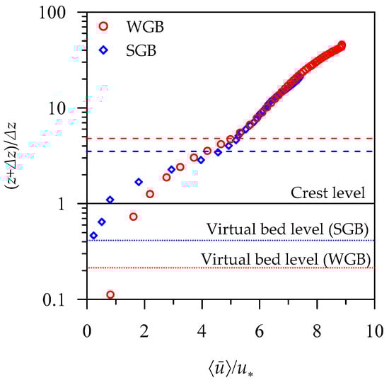 Variations of non-dimensional DA streamwise velocity with non-dimensional vertical distance (z + Δz)/Δz in the WGB and SGB. The red and blue broken lines indicate the form-induced sublayers in the WGB and SGB, respectively (data extracted from Padhi et al. [32]).