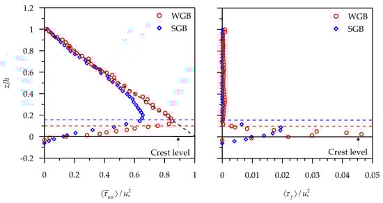 Variations of non-dimensional SA Reynolds shear stress ⟨⟩/ and SA form-induced shear stress ⟨τf⟩/ with non-dimensional vertical distance z/h in the WGB and SGB (data extracted from Padhi et al. [32]).