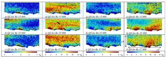 Flow structures as examined with the quadrant analysis: (a–c) first quadrant (outward intersections); (d–f) second quadrant (ejections); (g–i) third quadrant (inward intersections); and (j–l) fourth quadrant (sweeps) (data extracted from Hardy et al. [27]).