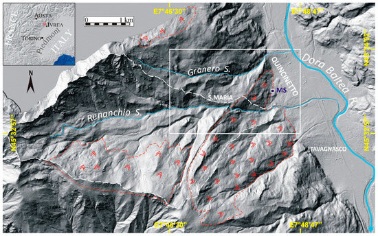 Figure 1. DTM reporting the right slope of Dora Riparia Valley in which the Montellina Spring (MS) is located and the Renanchio Basin. The red arrows represent the DSGSD areas. The white square indicates the investigated area.