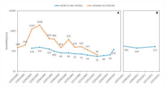 Figure 2. Montellina Spring and Renanchio Stream discharge ((A): modified from [15]; (B): modified from [16]).
