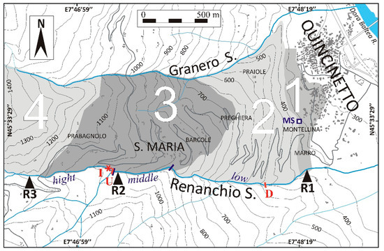 Figure 3. Location of the low, middle, and high stretches of the Renanchio Stream, reported in the text, and of the sectors of the investigated area. Sector 1 is essentially shaped in normally fissured bedrock; sector 2 is prevalently shaped in loosened bedrock; sector 3 is characterized by a wide cover of glacial marginal sediments; sector 4 (only partly reported in the sketch) shows a wide distribution of highly fractured bedrock and glacial sediments. I: location of the fluorescein and NaCl injection; U: Renanchio Stream upstream section; D: Renanchio Stream downstream section. The water samples for chemical analyses are also represented: MS (Montellina Spring sample site), and R1, R2, and R3 (Renanchio Stream sample sites).