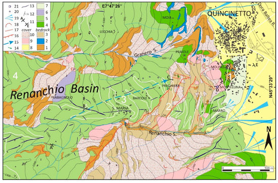Figure 4. Geological map of the Dora Baltea Valley slope comprising the Montellina Spring. (1) Eclogite micaschist and gneiss; (2) dolomitic marble; (3) loosened bedrock (essentially constituted by micaschist); (4) subglacial sediments; (5) glacial marginal sediments; (6) glacial marginal outwash and lacustrine sediments; (7) proglacial outwash sediments; (8) torrential and fluvial sediments; (9) landslide sediments; (10) debris; (11) cross-section trace represented in Figure 5; (12) foliation attitude; (13) moraines; (14) glacial striae; (15) buried glacial valley floor; (16) minor scarps; (17) trenches; (18) landslide niches; (19) alluvial fans; (20) minor springs; (21) Montellina Spring. The sectors 1, 2, 3, and 4, as indicated in Figure 3, are also reported.