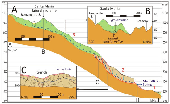 Figure 5. Schematic cross-sections (see the legend in Figure 4). (A) The water of the high Renanchio Stream (upstream of the fluorescein injection) infiltrates the glacial marginal sediments of sector 3 (upstream of the Santa Maria lateral moraine) and essentially flows through the buried glacial valley. This water flow continues in the loosened rocks of sector 2, supplied by the water infiltrating in the open fractures, feeding MS. (B) Cross-section of the buried glacial valley, covered by glacial deposits, in which groundwater is conveyed. (C) Detail of the loosened rocks that transfer the groundwater of the buried glacial valley to MS, especially through longitudinal trenches.