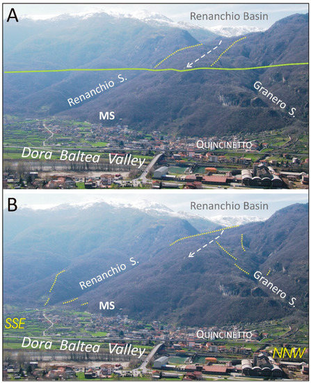Figure 7. Location of the Montellina Spring (MS) along the right slope of the Dora Baltea Valley during LGM (A) and Lateglacial (B). (A) Downstream of the high Renanchio Basin (sector 4), clearly shaped by the Renanchio Glacier, a buried glacial valley floor (white arrow) is assumed, covered by the Renanchio Glacier sediments forming large lateral moraines (yellow lines) (sector 3). This valley floor ends at approximately 675 m, where the confluence of the tributary glacier with the main Dora Baltea Glacier was likely located (green line). The lower strip of the slope (under the green line) (sectors 2 and 1) is essentially shaped by the Dora Baltea Glacier. (B) The retreat of the main Dora Baltea Glacier during the Lateglacial favors the subsequent advance of minor lateral glaciers (Renanchio and Granero glaciers) into the current incisions until the main valley floor.