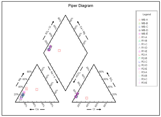 Figure 10. Piper diagram, including all sampled waters in the four sampling campaigns. The samples are referred to in Table 2. The apexes of the cation ternary plot are calcium, magnesium, and sodium plus potassium. The apexes of the anion plot are sulphate, chloride, and carbonate plus hydrogen carbonate.