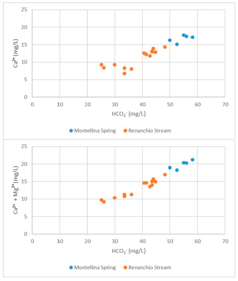 Figure 11. Plot of HCO3 versus Ca2+ concentrations and HCO3 versus Ca2+ + Mg2+ concentrations in the groundwater and surface water of the investigated area.