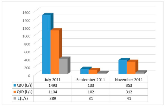 Figure 12. Comparison of the Renanchio Stream discharge in the upstream section (QtU) and downstream section (QtD) and losses (L) between the upstream section and the downstream section, in the three surveys (Test 1 in July 2011, Test 2 in September 2011, and Test 3 in November 2011).