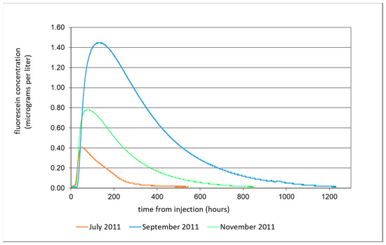 At last, the analysis of the tracer recovery curve permits different information to be derived. The shape and magnitude of the dye-breakthrough curve are most influenced by: (1) amount of injected dye, (2) velocity and magnitude of the flow, (3) hydraulic properties of the flow path taken by the tracer dye, and (4) other factors that affect mixing and dispersion of the tracer dye in the aquifer [46,47]. Tracer constituents in groundwater systems typically show an initial “breakthrough”, which is an indication of the arrival of the tracer constituent. The “residence time” or travel time of the bulk of the tracer-constituent mass is typically indicated by the time from the beginning of the injection to the peak concentration of the tracer constituent [47,48]. Then, a sharp peak and rapidly receding concentrations can indicate little storage in the groundwater system. A broad peak and gradual decline of the receding concentrations can indicate slow groundwater velocities or ample storage capacity in the aquifer. Multiple peaks of the tracer-recovery curve can indicate multiple flow paths for tracer movement through the groundwater system, where the different flow paths have different residence times [49].
