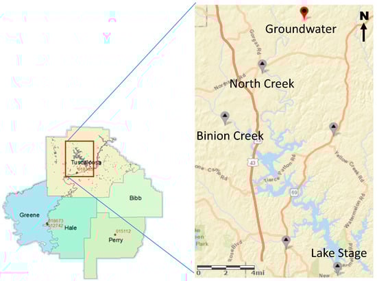 The study site was the Lake Tuscaloosa watershed in Tuscaloosa, northern Alabama, USA. The lake has been the primary source of drinking water for the city of Tuscaloosa (200,000 consumers in 2014) since 1970. Lake Tuscaloosa has an approximate volume of 150,000,000 m3 and a surface area of 23.82 km2 [38]. The lake is fed by four major streams which have U.S. Geological Survey (USGS) gauge stations—North Creek, Binion Creek, Bush Creek, and Carroll Creek—which represent most of the surface flow into the lake, as well as many smaller streams that do not significantly contribute to the lake. North and Binion Creeks have the highest discharge and the best coverage of measurements, and hence they are used as the streams for this study. The lake sits primarily in the Pottsville Formation, a Pennsylvanian aged sandstone interbedded with shale and siltstone, as well as the lower Coker Formation, a Cretaceous unit with sand and gravel beds. The lake is partially fed by groundwater from these aquifers, as are the streams that flow into it [39].